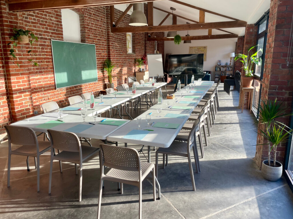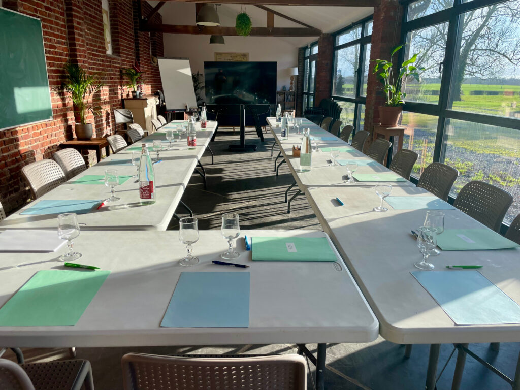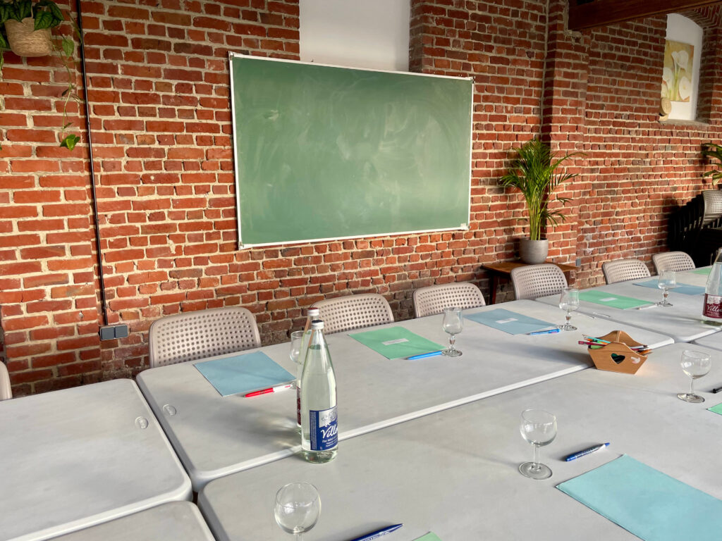 Idéale pour un séminaire d’entreprise ou une salle de formation près de Lille, notre salle de réunion accueille de 20 à 70 personnes dans un cadre chaleureux, lumineux et apaisant, loin de l’agitation urbaine.